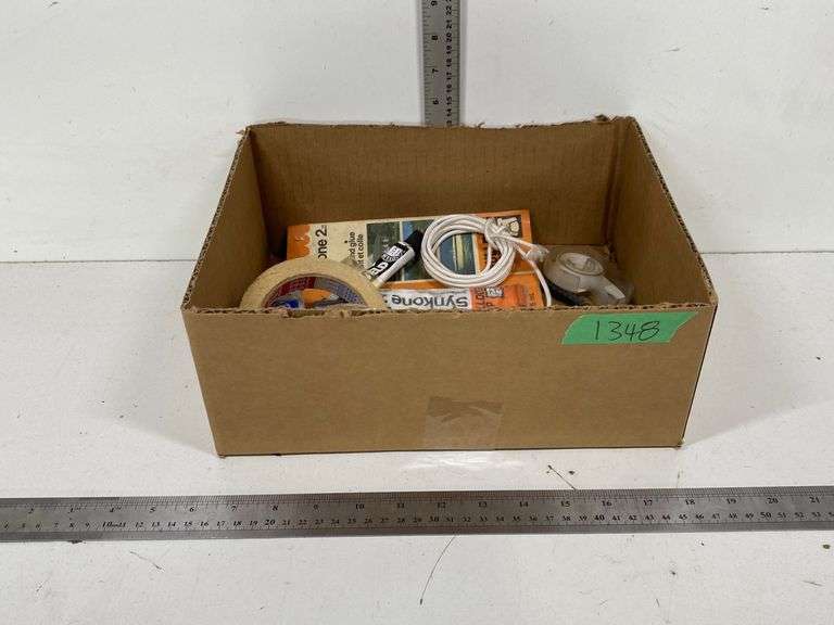 LOT 1348 - BOX MISC TAPE/GLUES/ROPE, Approx 14 pces