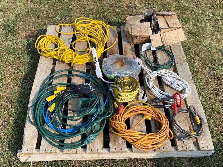 LOT 1098 - PALLET OF 5 EXTENSION CORDS, SPLITTER, POWERBAR, ROLL OF LANDSCAPE LOW VOLTAGE WIRE, BOX OF PATIO LIGHTS, 2 PINS FOR HITCH, TIE DOWN, CABLE LOCK