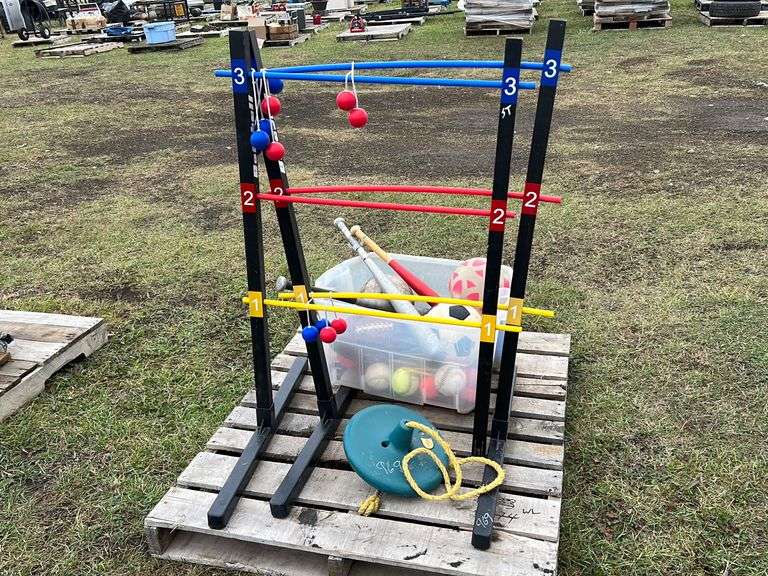 LOT 969 - BOLA BALL LADDER GOLF GAME 8 PCE, LITTLE TIKE'S SWING SEAT 10" DIA, PLASTIC TOTE OF SPORTS EQUIPMENT 14 PCE