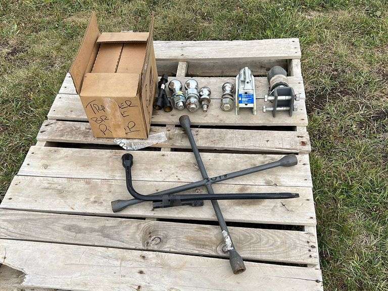 LOT 3018 - 4 BALL HITCHES, 2 TRAILER COUPLERS, 3 TIREIRONS, BOX W/ TRAILER BRAKE