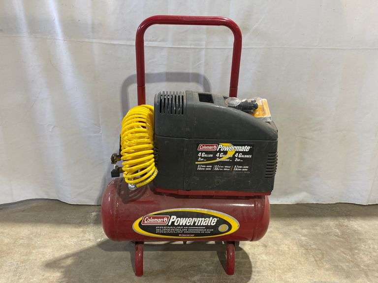 LOT 1931A - COLEMAN POWERMATE COMPRESSOR, 4 GAL 2 HP, 307 CFM @ 40 PSI, 216 CFM @ 90 PSI, 3/8" HOSE W/ TIRE CHUCK, GAUGES BROKEN