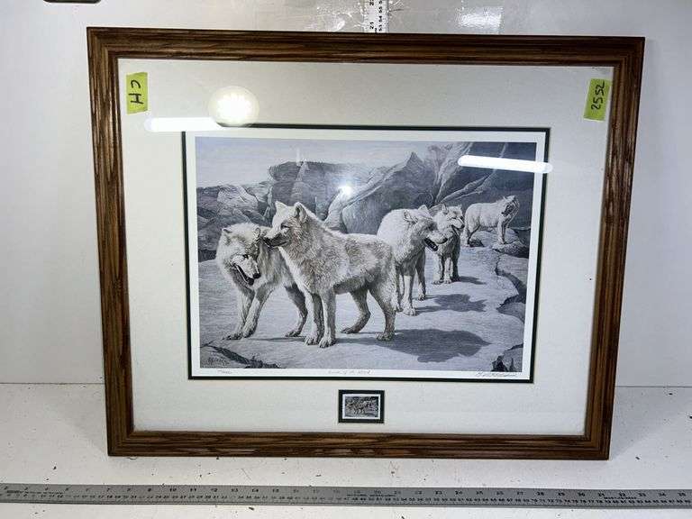 LOT 2552 - Lords of the North Wolf picture in frame approx 26" x 22"