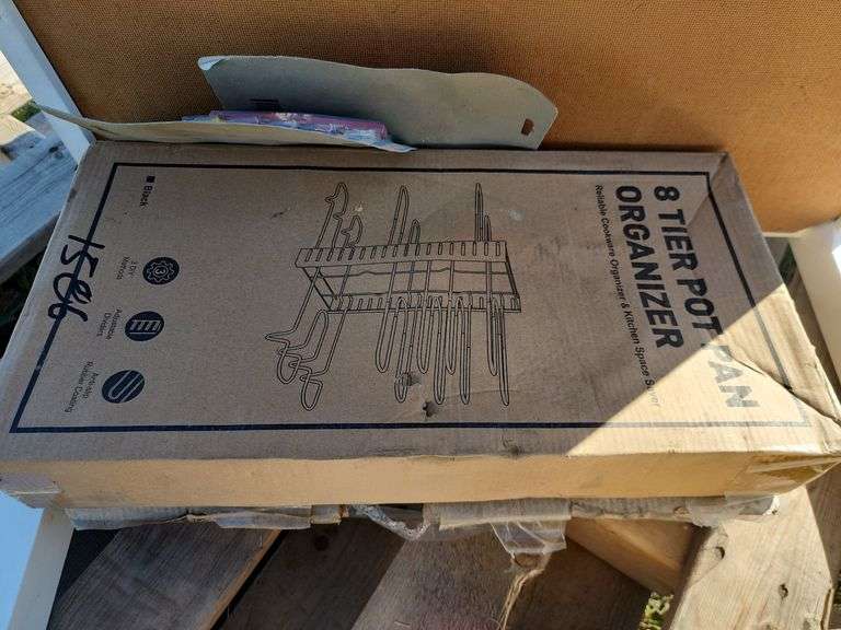 LOT 1586 - Pallet w/ Desk approx 26"x25"x34", fuses, LED lights, 8 tier pot pan organizer